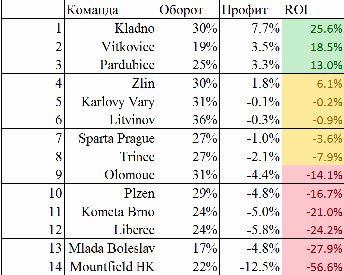 Падение проходимости ставок и ROI произошло в конце сезона в связи с чем общий результат оказался отрицательным. Вцелом, мне кажется, что чешкой экстралиги вполне возможно держать уровень 3-5% РОИ